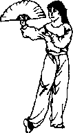 (8)重心后移,右手下摆至右斜后下方,扇顶斜向下,手心向 右;左手向左前上方伸直,手心斜朝下。目视扇顶(图3 - 57 - 98)。
