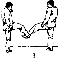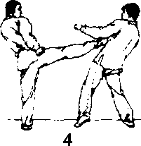 [1]对方弹腿击我裆部,我即用右勾踢拦住其进攻的小腿(图 4-30-3);[2]如其收腿,我即迅疾抬腿踹击其上盘(图4-30-4)。图 4-30