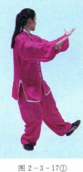 (1)两手左顺右逆缠向右、向后方捋身体先以左脚跟为轴再以右脚跟为轴向右后旋转180度。右手位于胸前中线掌心向右上左手拉于左肩前掌心向上目视左前方。(图2-3-1712)