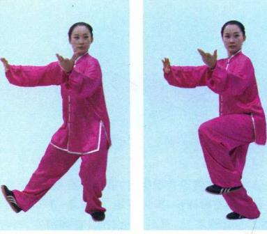 (2)重心右移身体微右转左腿屈膝提起左托掌右撑掌目视前方。(图