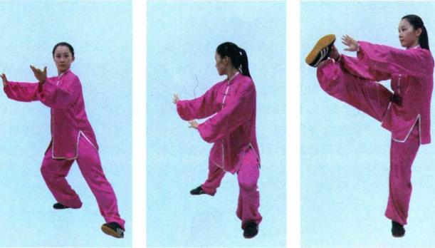 (5)重心在左腿提右腿向左走下弧向上再向右摆击两手掌向前与右脚外侧击拍相合目视前方。(图2-3-176)