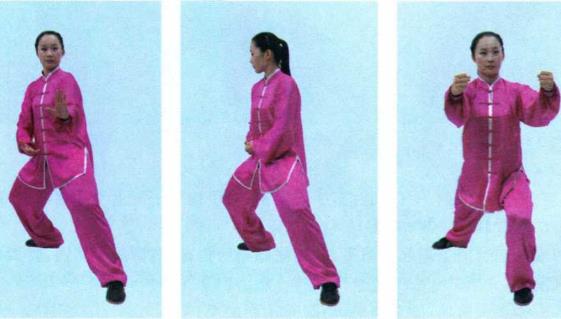 (2)身体微右转重心移至右腿同时两手左顺右逆缠随重心后移下捋复再变拳合于右胸侧目视左前方。(图2-3-182)