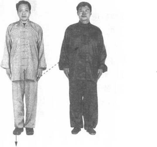 甲乙双方同一方向并步站立,两手成掌自然下贴两大腿外 侧。左右间隔约一步。目视前方(图I)。