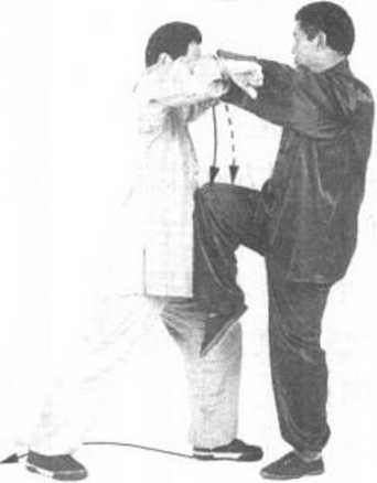 乙方:双拳变掌, 向上、向下、向外分 挂甲两前臂,掌指均 朝下。同时,右腿屈 膝上提用膝尖顶撞甲 方小腹,脚尖朝下。 目视甲方(图99)。