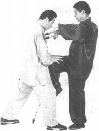 图99甲方:左脚向后 退一步落地,双腿右 屈左直成右弓步。双 拳变掌向下拍按乙方 右膝。目视乙方右膝 (图100)。