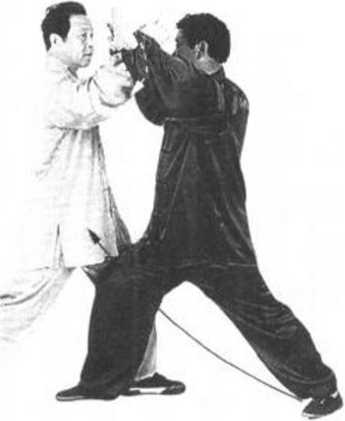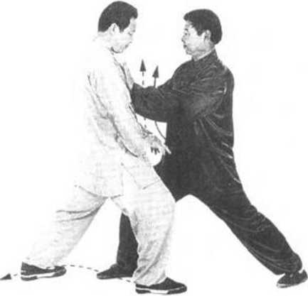 乙方:双掌下落 至胸前屈腕成立掌向 前猛力推击甲方胸部, 掌指朝上。同时,右 脚向前落步,右腿屈 膝,左腿蹬直。目随 双掌(图101)。