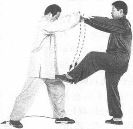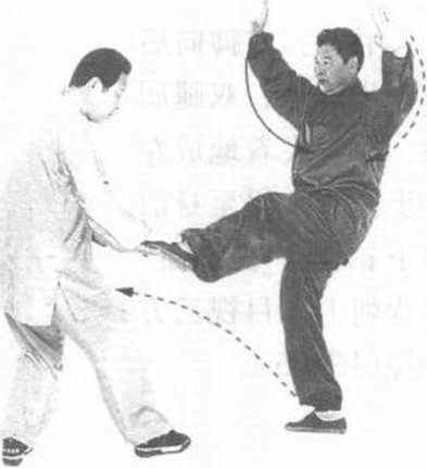 乙方:双掌向下、 向里、向上、向外 (左掌左、右掌右) 缠捋挑拨甲方两前臂, 双掌指均朝上。同时, 左脚由身后向前弹踢 甲方小腹,腿伸直, 脚背绷平,力达脚尖。 目视甲方(图103)。