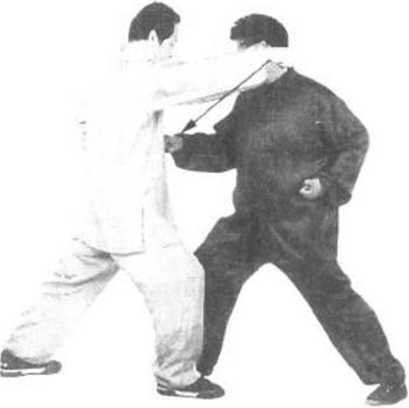 乙方:步型不 变。左掌向上格挡甲 方右臂后屈肘收至左 腰间,掌心朝上;右 掌变拳向前直击甲方 胸部,拳心朝下。目 视甲方(图7)。