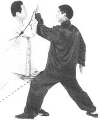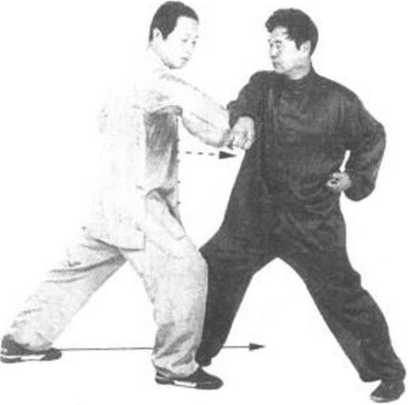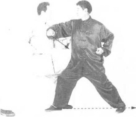 甲方:左脚向前 迈一步落地,腿即屈 膝,右腿蹬直。伴随 左脚向前迈步,左掌 变拳,顺势向前直击 乙方右肋,拳眼朝 上,右掌屈肘收至右 腰间。目视乙方(图 9)。