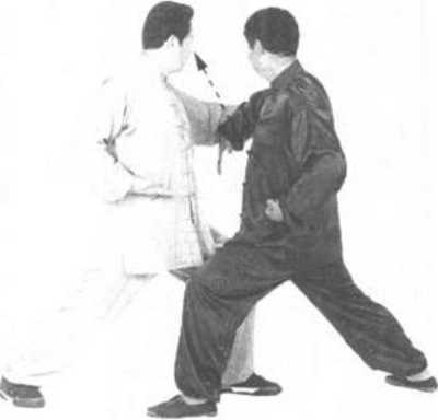 ^ 7甲方:步型和左 掌动作不变。右掌向 下、向右磕挂乙方右 拳腕(图8)。