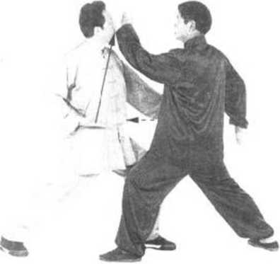 甲方:步型不 变。右掌由右腰间向 上用掌背于脸前迎击 乙方左掌,掌心朝 里,掌指朝上;左拳 屈肘回拉至左腰间, 拳心朝上。目视乙方 (图 12 ) ,: