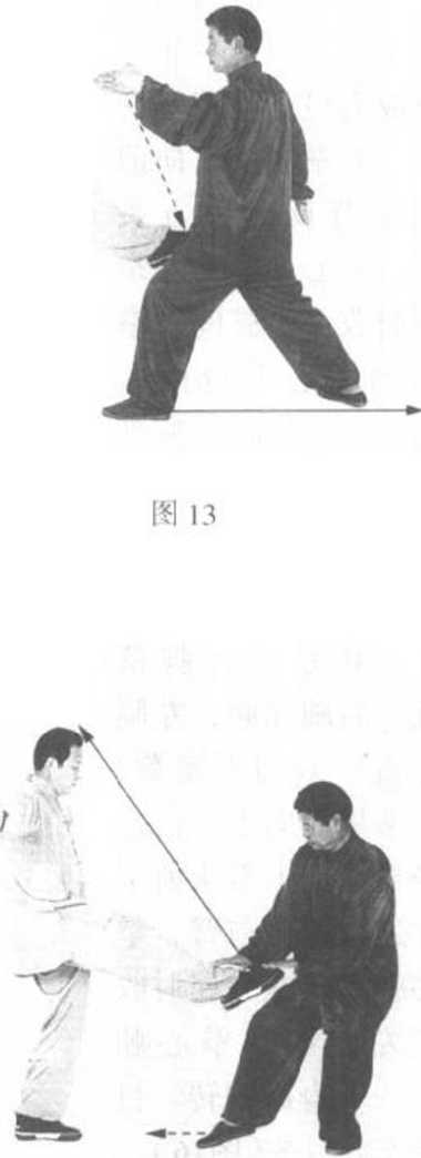 右脚从身后向前弹踢 乙方小腹,脚面绷 平,力达脚尖。目视 乙方(图13)。