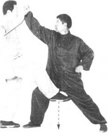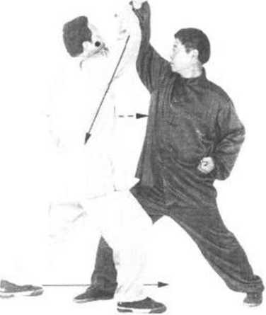 甲方:右脚落 地,右腿屈膝,左腿 伸直。双勾手变拳, 右拳屈肘向下、向左 经身前向上至头前上 方迎击乙方前臂,拳 心朝下;左拳屈肘收 至左腰间,拳心朝 上。上身微右转。H 视乙方右拳(图16):