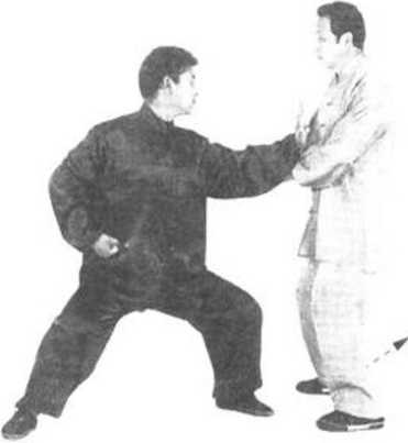 甲方:上身左 倾并微左转,左腿 屈膝,右腿伸直。 左掌向上至胸前迎 架乙方左掌腕,掌 心朝前;右掌向后 摆至身体右后方, 掌心朝下。目视乙 方左掌(图124):