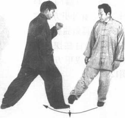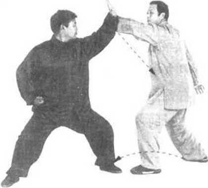 m 125甲方:用右脚脚脖 向前勾踢乙方左小腿, 身体随即左转,左腿微 屈膝,右脚离地。随转 身踢腿,左掌向下、向 左,右掌向前,双掌摆 至身体两侧。目视乙方 (图 125)。