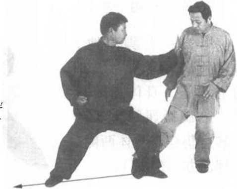 乙方:左脚后退一 步落地,闪过甲方右脚 勾踢,身体左转,双腿 右屈左直成右弓步。双 掌随转身摆至身体两 侧。目视甲方右脚(图 126 )〇