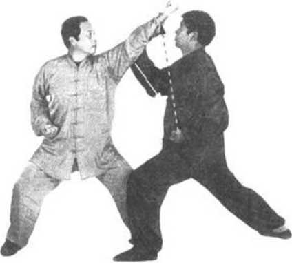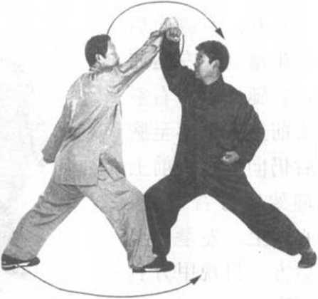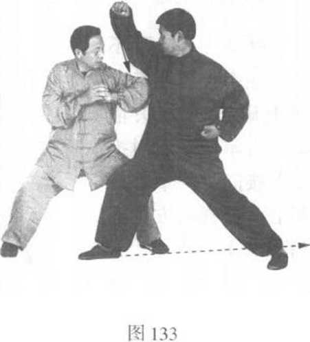 甲方:右拳变 掌,臂内旋向上、向 右缠捋乙右前臂。同 时,左脚向前迈一步 落地,身体右转,双 腿屈膝成马步。左拳 屈肘用肘尖向左捣击 乙方右胸,右掌抱至 左拳上。目视乙方 (图 133^