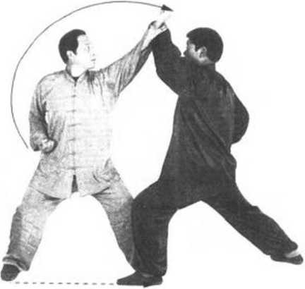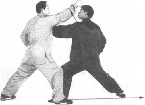 乙方:右拳变 掌,由头前上方下落 至胸前向左、向前推 击甲方左肘,掌指朝 上。同时,右脚向后 退一步落地,双腿左 屈右直成左弓步。目 随右掌(图134)。