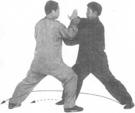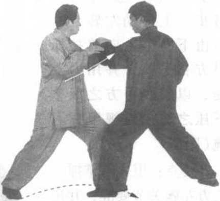 乙方:右脚向左前方 上步,双腿右屈左直成右 弓步。上体稍左转,右 手由下向上、向前扣抓 甲方右手腕,并用力上 提,以解脱甲方之滚拿 下压之势。目视甲方右 腕(图15)。