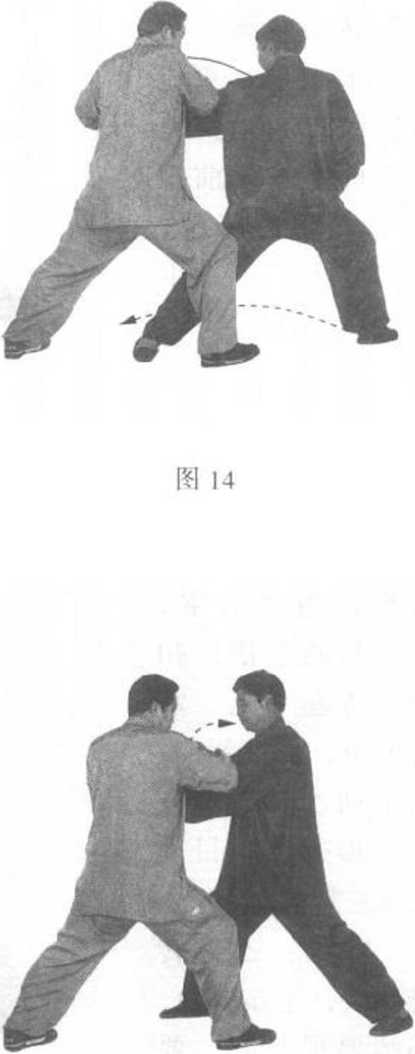 甲方:右脚向前迈一 步落地,腿即屈膝,左腿 挺膝伸直成右弓步。右掌 抓紧乙方左腕根部,身体 微左转,双手同时用力向 乙方左肩方向缠拧,同 时,右肘向乙方左肘关节 部摆动,并使肘尖压于乙 方肘关节部位,随即左腕 上撅,右腕、右肘用力下 压之。目视乙方左肘关节 (图 14)。