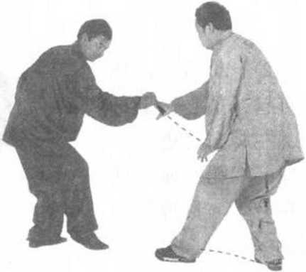 乙方?.右掌稍外 旋,抓握甲方右掌 食、中二指。身体稍 左转,左脚向后退一 步落地,腿即屈膝, 右脚尖着地成右虚 步。同时,全身下 沉,右掌用力向前下 方拉、压、撅甲方食 指和中指,掌心朝 左,虎口朝上。目视 甲方右掌(图17)。