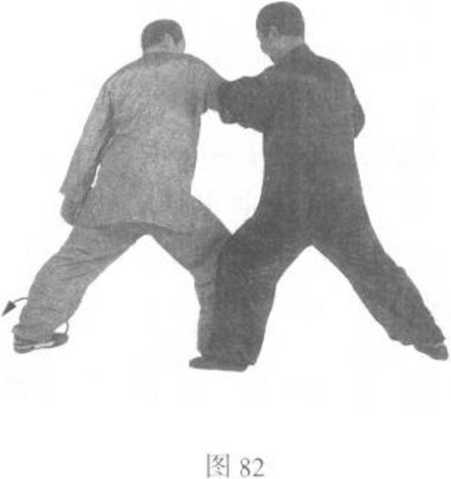 乙方:身体稍右 转,左脚向前迈一 步,腿即屈膝,右腿 伸直。同时,右掌屈 肘上提,向外扣抓缠 抒甲方右手腕,使甲 方右掌心向上,自己 虎口朝前;左掌由左 向右、向上、向下推 压甲方右肘,掌心朝 下,虎口向右。目视 甲方右肘(图82)。