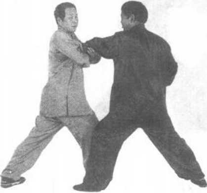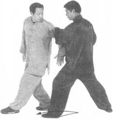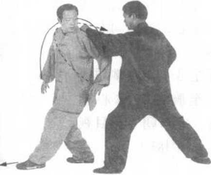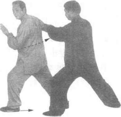 随即左脚向前上步,腿 即屈膝,右腿伸直。左 掌同时向上、向前推抓 甲方后背,掌指朝上。