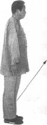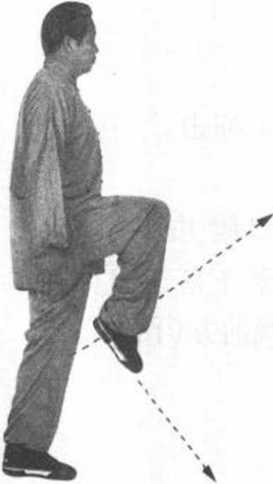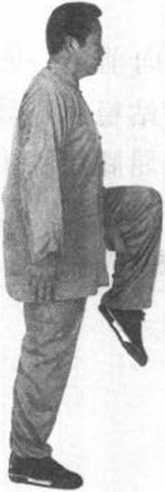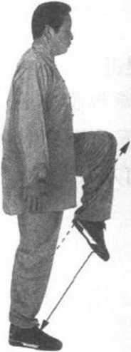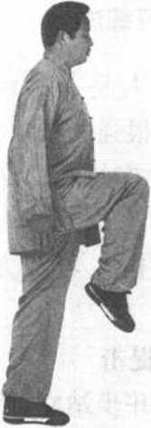 ② 右脚站稳,左腿屈 膝猛力上提,脚尖朝下。 目视前方(图91 )c