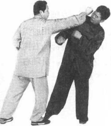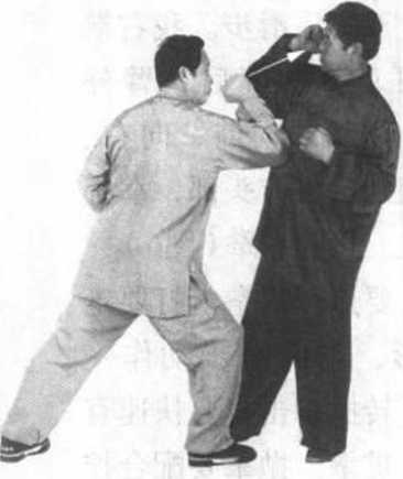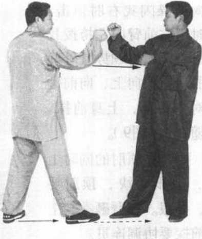 ②我右、左脚先后向 前迈步,右臂屈肘用肘尖 向前顶击对方胸部,右腿 屈膝,左腿伸直。目随右 肘(图8)。