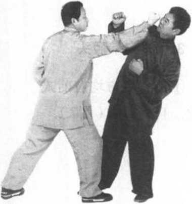 ③ 对方双脚后滑步, 身向后躲闪我右肘顶击。 同时用右前臂向左挎拨我 右肘。我右肘顺势臂外旋 伸肘用拳背向上、向前砸 击对方头部,上身前探。 目随右拳(图9)。
