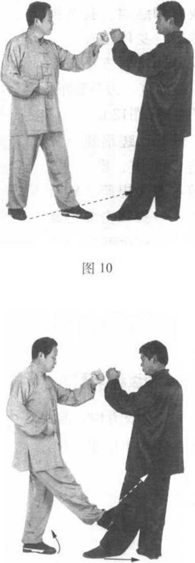 ②我左脚前迈半步, 右脚由身后向前横脚蹉 踹对方左小腿迎面骨, 腿伸直,脚尖斜朝右上。 目随右脚(图11)。