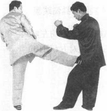 ③ 对方左脚后退躲 闪我右脚蹉踹。我右脚 蹉踹后,身体左转,右 脚向右踹击对方小腹部 位。腿伸直,力在脚跟。 目随右脚(图12)。