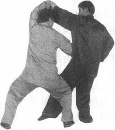 ② 对方用右拳向前 直击我头部。我双拳变 掌,向上、向右捋缠对 方右前臂,同时,左脚 向前上步,双掌屈腕成 立掌,向前猛力推击对 方右肋胸部位,双肘微 屈。左腿屈膝,右腿蹬 直。目随双掌(图68)。