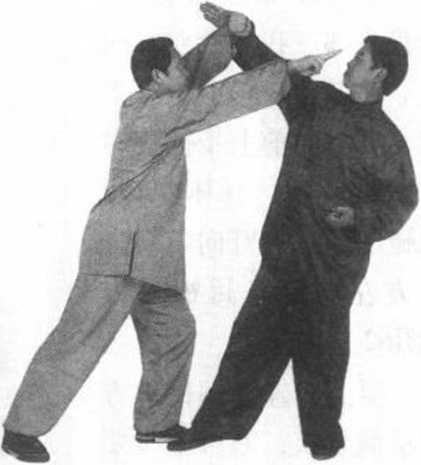 要点:左拳迎架与右 掌指前戳要同时进行。右 掌戳目要快、要准、要 狠。