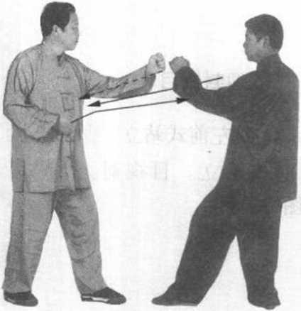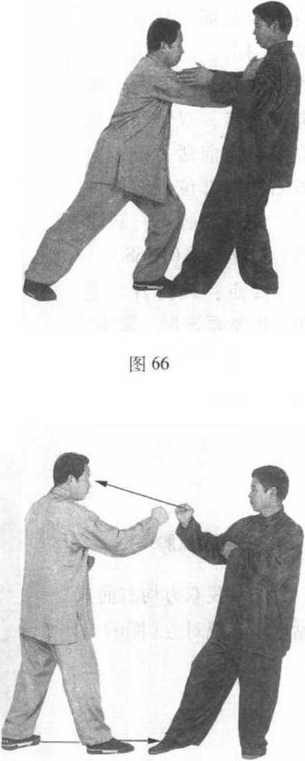 ②对方双拳变掌,屈 腕成立掌向前推击我胸 部:^我双拳变掌向上、向 外分挂挑击对方双掌腕 后,屈腕成立掌向前猛力 推撞对方胸部,上身前 倾,双肘微屈。目视对方 (图 66 )。