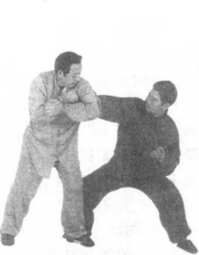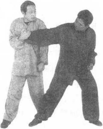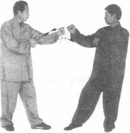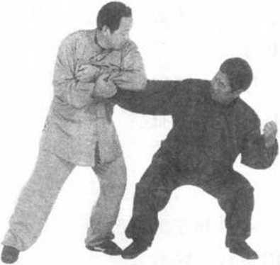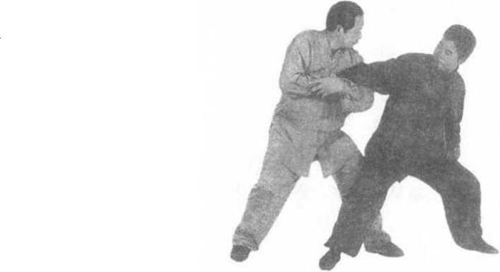 ②对方右脚上步,用 右手抓住我胸部。我用右 手扣住对方右掌,身体右 转,用左上臂向右靠击对 方右肘关节。目视对方(图 28)。