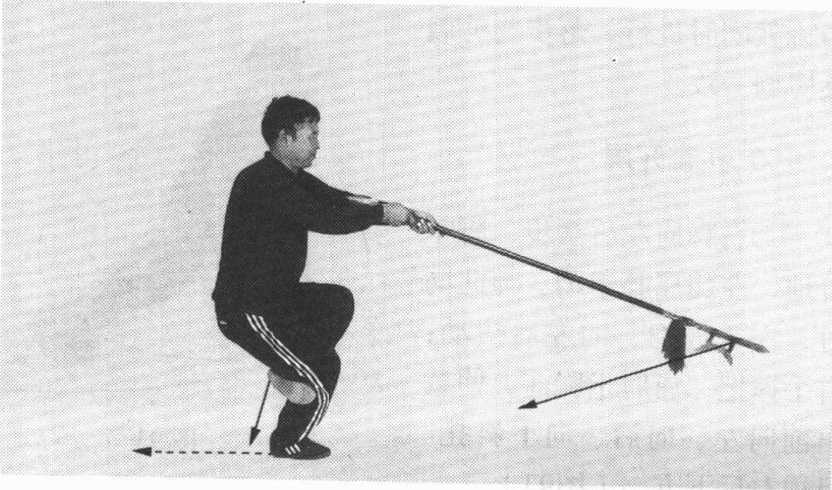 重心移于右腿,左腿离地屈膝,左脚背贴扣于右膝后侧, 右腿随即屈膝下蹲。与此同时,两手持戟,使戟月锋由后向 上、向前、向下劈点。目视前下方。(图95)