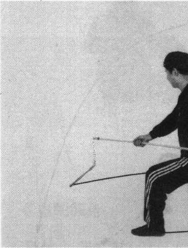 用途:敌持械于前方攻我下盘,我用大棍梢向左格击敌 械,小棍梢扫击敌下盘。