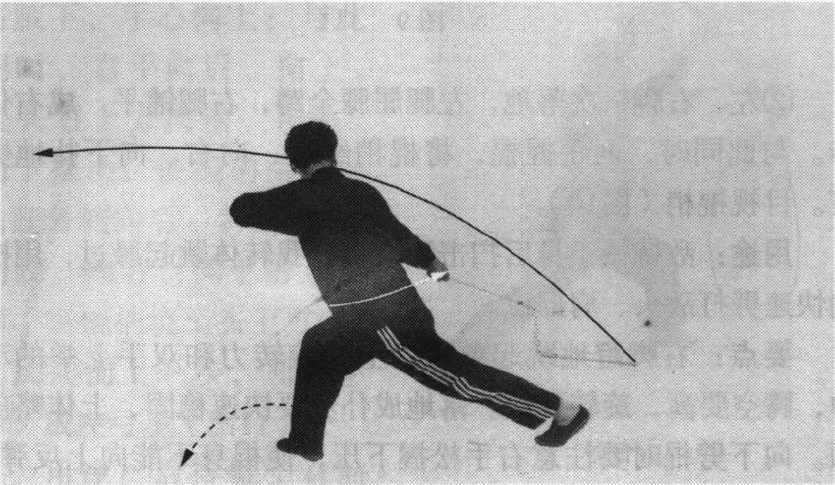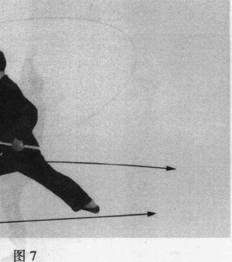 “①身体左转,成左弓步。同时,左手屈肘摆于左腰侧;右 手前摆至腹前,两手握棍,使棍梢由后向右前方扫击地面。目 视右前方(图7 )o