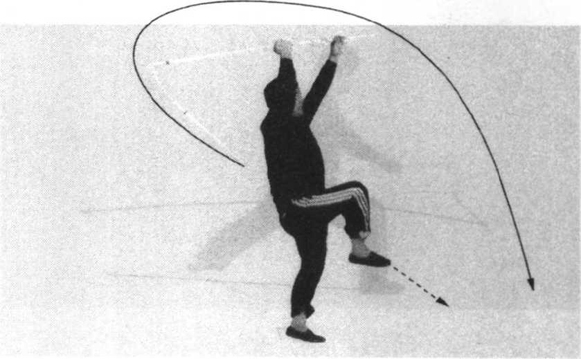①右脚蹬地跳起,左腿随之屈膝提摆,身体腾空左转 270%双手握棍,随体转举至头顶上方,棍梢斜向左后下方 (图9)。