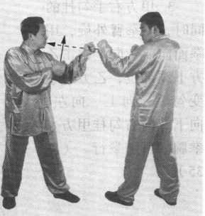 2. 乙方左拳臂外 旋,向前、向上攉打甲 方下颌部位,拳心向 后,甲方右拳变勾手, 向上、向左、向下、向 右勾挂乙方左拳腕。目 视对方。(图34)