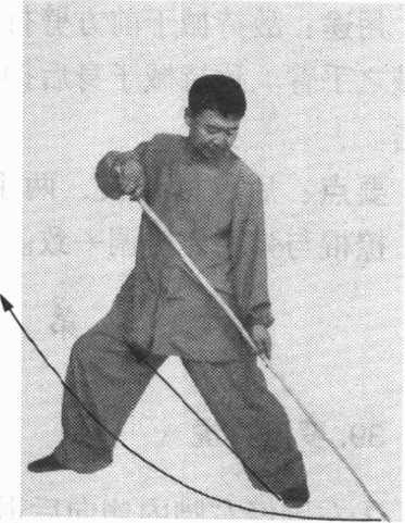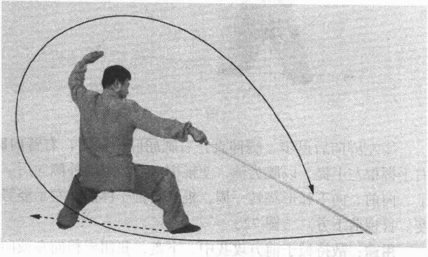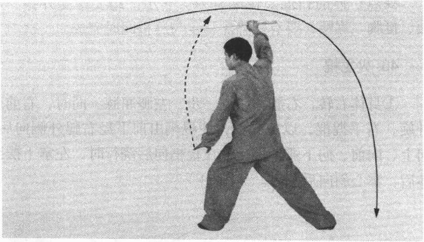 图67图67左手握棍,经左肩外向后 弧形摆动;右前臂内旋, 右手顺势摆至左胸前,手 心斜向下,使棍梢由前向 上,经体左上方向后、向 下点击地面。目视棍梢 (图 67)。
