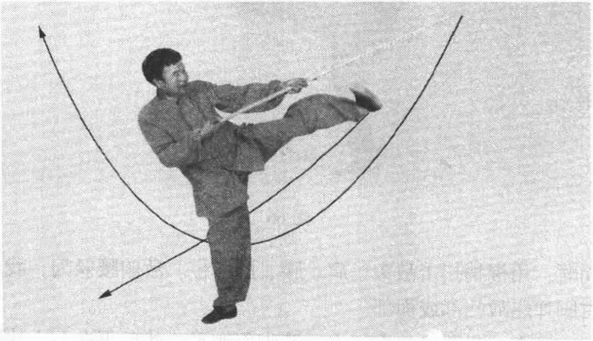 ②左手握棍,经体侧前上举,高与头齐;右手顺势摆至额 右侧,两手握棍,使棍梢由后经体左侧向前上方撩击。当棍梢 撩至体左侧时,右腿直立,左脚向前快速弹踢,高与腰平。目 视前上方,(图68)