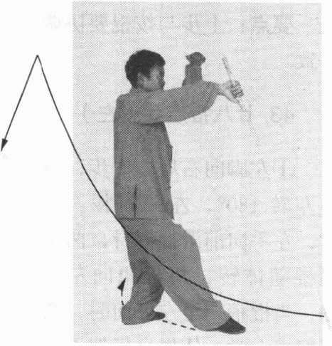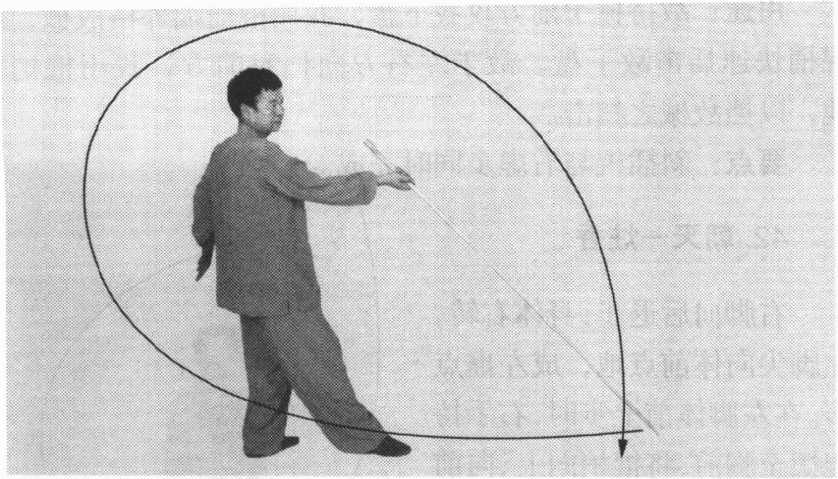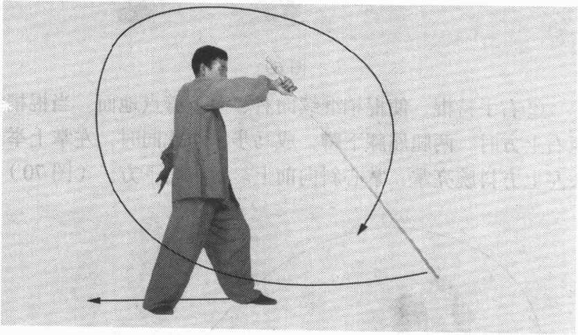 ①身体右转,右脚向后退一步,左腿屈膝。同时,右前臂 外旋,右手握棍,以腕为轴,使棍梢由前下经右腿外侧向后、 向上、向前、向下弧形绕行;在棍梢向后绕行时,左掌下摆至 体后,掌心斜向后下方。(图71)