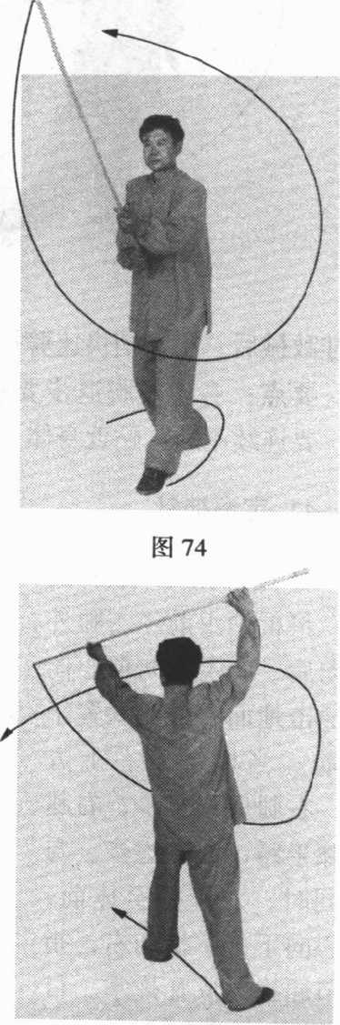 右臂外旋,右手握 棍,将棍梢由前经右腿外 侧向后、向上、向前、向 下插击地面,棍身斜置于 身前。当棍绕至右上方 时,右腿后移半步,右腿 屈膝半蹲,成右虚步。与 此同时,左掌摆至体前, 手心向下,掌指向右,指 关节屈拢,成瓦拢掌。目 视棍梢。(图73)