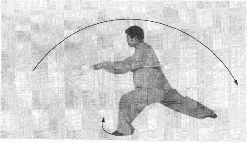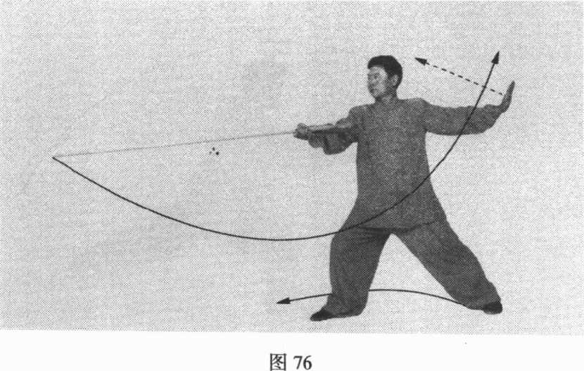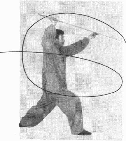 心向下,使棍梢由前向左、向后、向右、向前,在头顶上方平 绕一周后继续向左下方弧形绕行。当棍梢绕至右上方时,左腿 屈膝,右腿伸直,成左弓步,上体随之左转。目视棍梢。(图 78)