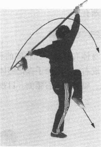 用途:敌于左前方攻我中盘,我用戟前端缠拦敌械,并顺 势下扎敌下盘。敌持械于右前方攻我中、下盘,我用戟月锋锁 卡敌械后,使戟月锋顺敌械杆反削敌持械之手臂。