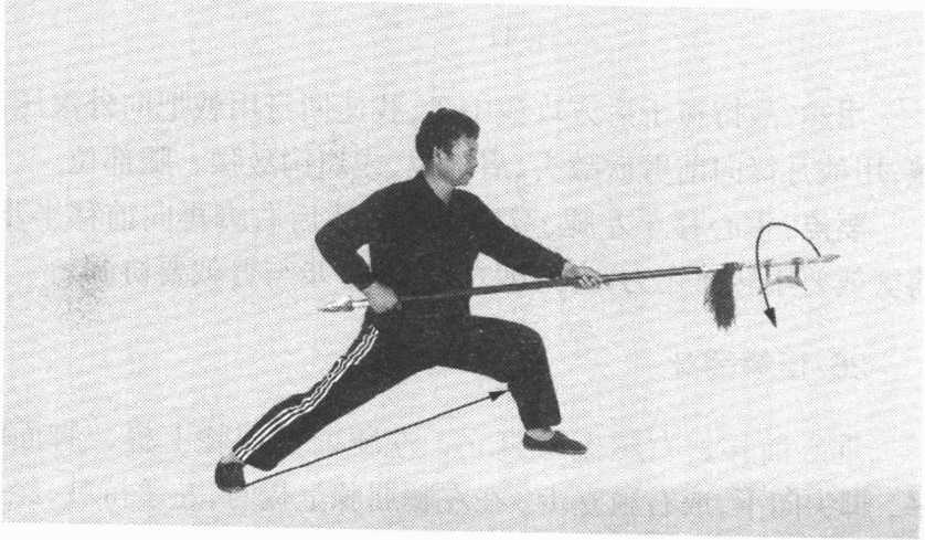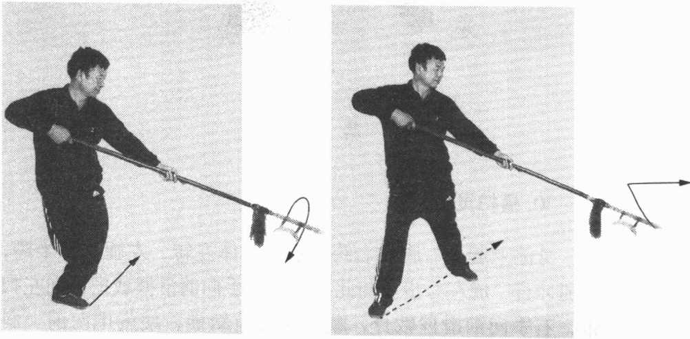 ①身体稍上起,右脚向左跨步,身体右转。两手握戟,以腕为 轴,使戟尖向上、向左、向下缠绕半周。目随戟尖移动。(图50)