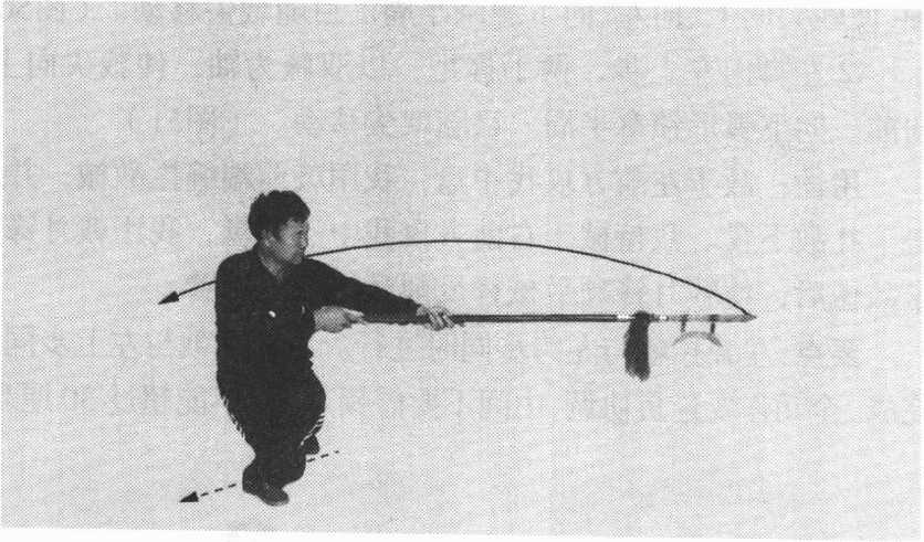 图48图48右腿伸直,成左弓步。左 顺势向右腰后抽拉,戟月右腿伸直,成左弓步。左 顺势向右腰后抽拉,戟月左脚体前落步,左腿屈膝半蹲, 手持戟向上、向前劈按;右手握把, 锋向下。目视前方。(图49)