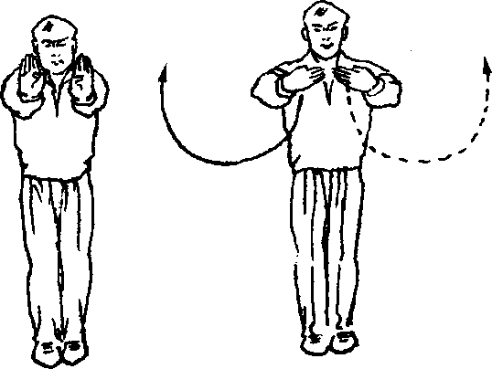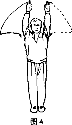 ①两臂外旋,捏手成勾,直臂上抬身前,勾尖朝上(图2)。②上动不停,两勾手屈肘后收腋前,臂内旋从两腋前向 下、向后勾挂至身后,臂伸直,勾尖朝上(图3)。图32 .掌推南山①两勾手变掌,直臂由身后经身两侧向前、向上弧形绕举 至头上方,掌心朝前(图4)。②上动不停,双掌臂内旋向身两侧弧形下降与肩平时,屈 肘向下、向后绕行腋后,掌心朝上平掌从两腋下前穿至腋前时,臂内旋翻掌屈腕成立掌向前推出,掌指朝上。目视双掌(图5)。图5 图6
